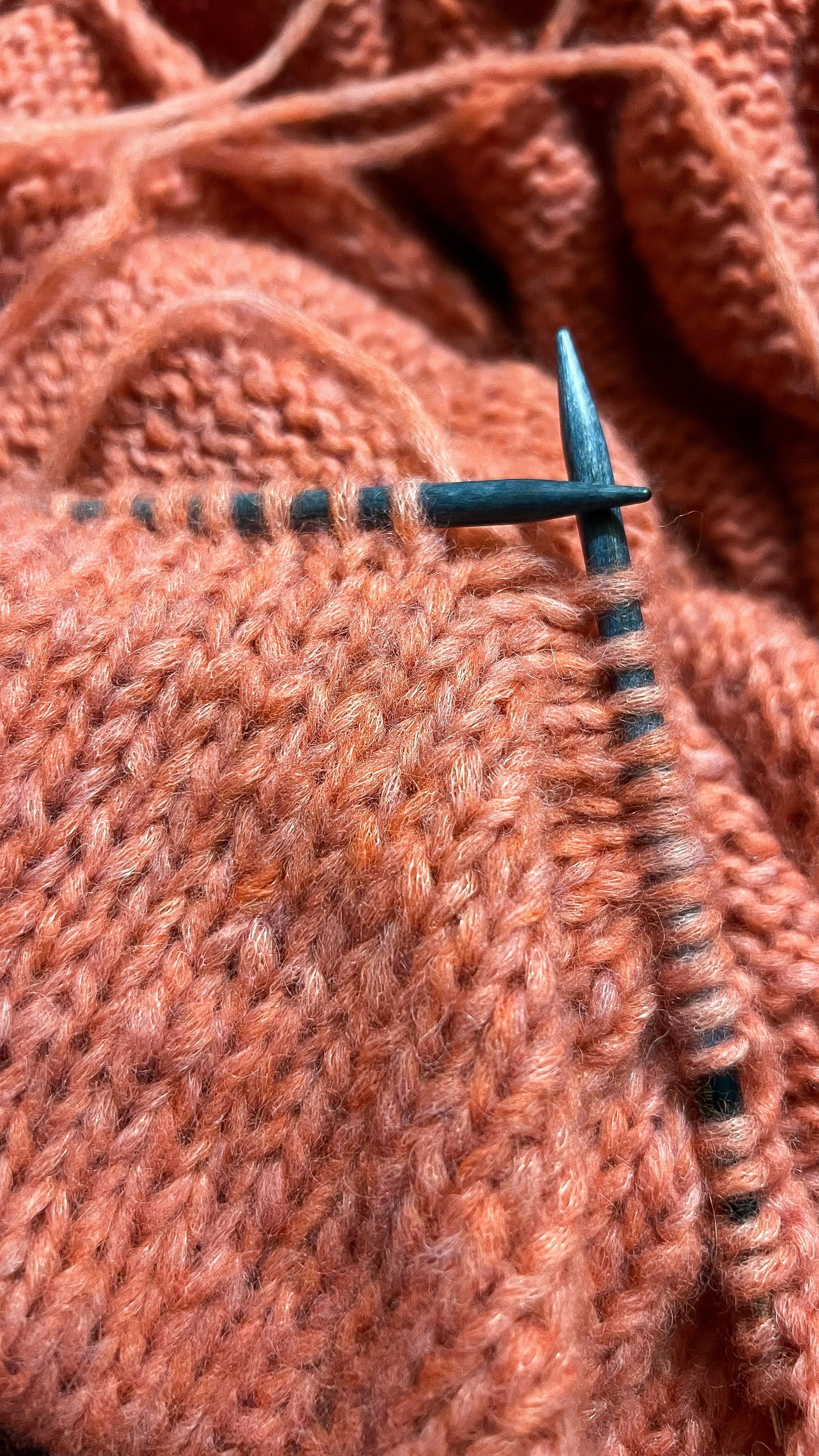 After working on my knitting project for several days, I realized that my sweater was twisted on the circular needles. I sent photos to my friend thinking she’d know what to do. She couldn’t tell what I’d done from the photo so I brought my sweater to her house. When we looked at it together at her dining room table, the proof was in the pudding. The sweater was twisted. I’d have to take out all eight inches and start from scratch. It took me a week to get back to where I’d been when I messed up. The second sweater disaster wasn’t quite as bad, but I still needed my friend’s help to reverse my error. She showed me how to carefully take out stitches to preserve the rest of the sweater.